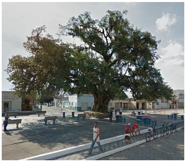 A segunda e terceira figueiras estavam próximas entre si e deram origem a dois largos, um ainda existente: o primeiro, na Estrada Geral, depois estrada Rio-São Paulo, originando a atual praça Gama Rodrigues (Figura 7), que é ainda hoje o principal acesso à cidade, resultante da abertura, na década de 1950, da avenida Dr. Peixoto de Castro, que estabeleceu a ligação dessa praça com a rodovia Presidente Dutra (Figura 6 - marcador 2). A árvore situada neste local foi cortada na década de 1970, por apresentar problemas fitossanitários que comprometiam sua estabilidade. Consta que havia, junto à figueira, um “dístico votivo, mandado colocar pela Prefeitura Municipal”, onde se lia “Figueira de Euclides da Cunha”.32 É bem interessante observar, também, como sinal dos tempos, que no registro fotográfico da década de 1970, um homem descansa sob a sombra da figueira, acompanhado de sua bicicleta.