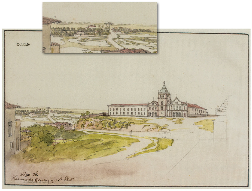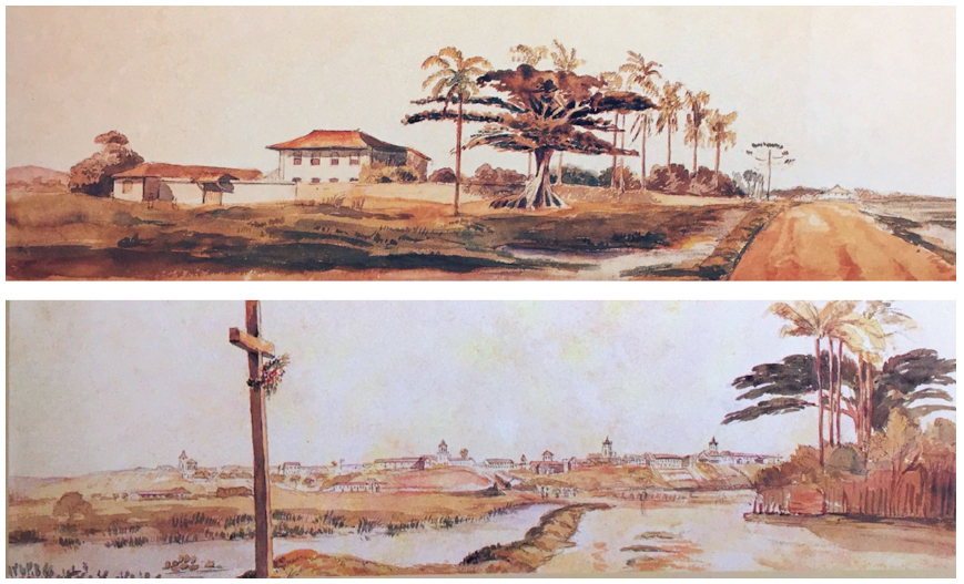 Os melhores registros da figueira, contudo, foram produzidos por William Burchell, em 1827: Taken from the road to Rio (Vista tomada do caminho para o Rio) - sem dúvida, o mais fidedigno registro daquela figueira-brava antes do desenvolvimento da fotografia (Figura 16, alto) -, São Paulo from the road to Rio (São Paulo vista do caminho do Rio) (Figura 16, embaixo) e An ecclesiastical building (Edifício religioso) (Figura 17). Esta imagem foi produzida praticamente do mesmo ponto de vista daquela produzida por Ender, dez anos antes, mostrada na Figura 15.