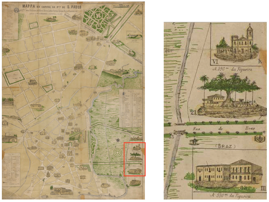 Concebido, portanto, como uma espécie de carta turística da cidade, já que vinham gravados todos os seus pontos importantes e pitorescos, era natural que constasse, entre eles, a Figueira da Marquesa, indicada como “Figueira do Braz”, desmesuradamente maior do que a sede da chácara, talvez denotando a importância daquela árvore na paisagem paulistana. Corrobora tal importância o fato de que duas edificações que o mapa indica como “fora da Cidade”, o Palácio Episcopal e a Igreja do Braz, são referenciadas a partir da figueira (Figura 20 - detalhe).