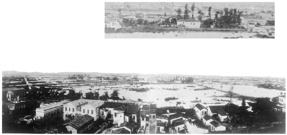 A várzea, constantemente inundada, era um problema que as autoridades municipais e estaduais se esforçavam para resolver, pois o crescimento industrial concentrava-se nos bairros além Tamanduateí. Essa problemática passou a ser tema para pintores e fotógrafos, como mostram as imagens produzidas por Militão de Azevedo e a belíssima tela de Benedito Calixto, Inundação da Várzea do Carmo, de 1892 (Figura 23), que pode ter sido o último registro da chácara e de sua sede (Figura 23 - detalhe).