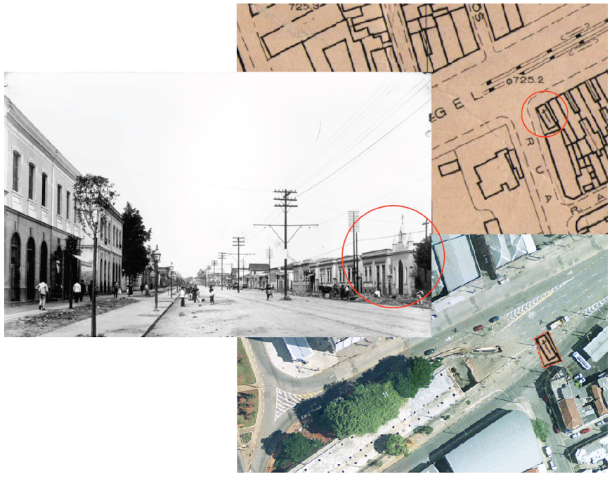A implantação da capela corresponde às instruções da Câmara, como se verifica no mapa da cidade de 1954 (Figura 26 - detalhe direito superior). Essa pequena ermida, preservada até o início da década de 1960, quando foi demolida em função das obras viárias realizadas no parque Dom Pedro (Figura 26 - detalhe direito inferior), marca a origem da rua Santa Cruz da Figueira, atual Capitão Faustino Lima, que circundava um dos volteios do rio Tamanduateí. Originalmente surgida à margem do braço do rio, essa rua ficou localizada nos fundos da quadra criada em decorrência da implantação do balão do Gasômetro.