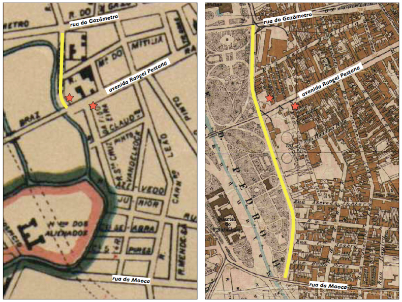 À frente dessa quadra, bordejando o novo parque, foi criada uma nova rua, que passou a ser a extensão da rua da Figueira, anteriormente localizada entre os aterrados do Brás e do Gasômetro. Como resultado, a rua da Figueira passou a ter mais que o dobro de sua extensão original. A comparação entre a Planta geral da capital de São Paulo organisada sob a direcção do Dr Gomes Cardim, de 1897, e o levantamento SARA-Brasil, de 1930, esclarece esse prolongamento. A Figura 27 mostra, à esquerda, a configuração da rua em 1897, estendendo-se desde a rua do Gasômetro até a avenida Rangel Pestana (em amarelo). À direita, o mapa de 1930 mostra a situação da extensão da rua da Figueira, surgida pela definição da nova quadra criada pela implantação do balão n. 1 e do parque D. Pedro II, indo encontrar-se com a rua da Mooca (em amarelo). Essa nova quadra é fechada, aos fundos, pela rua Santa Cruz da Figueira, a essa altura renomeada como Capitão Faustino Lima.