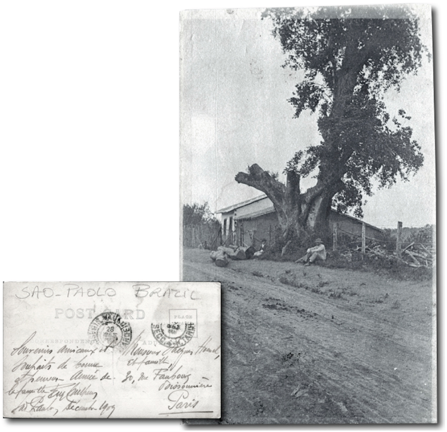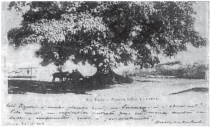 O mais interessante relato, no entanto, refere-se a Euclides da Cunha, que residiu algum tempo na cidade e em certa ocasião enviou um postal a um amigo, datado de 1902, com uma foto da figueira, onde pode-se ler: “Essa figueira é minha sombra aqui em Lorena, não é admirável?” (Figura 8).36 Esse postal faz parte do Álbum Postais da Cidade de São Paulo (1900-1940), série de imagens que o fotógrafo Guilherme Gaensly produziu no início do século XX, registrando vários aspectos da capital paulista e de algumas cidades do interior do estado, comercializadas como cartões-postais. A legenda da foto, “São Paulo - Figueira brava”, e o fato de constar daquele álbum podem levar a crer que essa árvore crescesse na capital paulista. No entanto, no exemplar do álbum pertencente ao acervo da Biblioteca Mário de Andrade, à direita da árvore vê-se, ao fundo, as duas torres da igreja de São Benedito, em Lorena (Figura 9). Ademais, o próprio Euclides da Cunha adicionou, à mão, no postal que enviava, o nome de Lorena ao lado da legenda original da imagem (Figura 8).