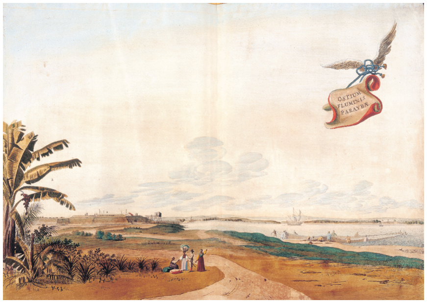 Em Obsidio et expugnatio Portus Calvi (Bloqueio e cerco a Porto Calvo), observa-se à esquerda um grupo de pessoas descansando sob uma frondosa árvore que, ao que tudo indica - seu porte, o raizame que “é tão extenso que chega a formar um notável emaranhado capaz de fixar o solo e impedir a erosão”,20 as características do tronco e da folhagem densa - seria uma figueira-brava. Quando se observa outra imagem produzida por Post, Ostium fluminis Parahybæ (Foz do rio Parahyba), embora se perceba que a estrutura da composição pictórica é a mesma, com a fortificação ao fundo, grupos de pessoas em primeiro e segundo plano e massas vegetais fechando a “boca de cena” à esquerda, nota-se que, ao contrário da primeira imagem, na qual um grupo de pessoas busca abrigo sob a sombra da figueira, as bananeiras presentes nessa segunda imagem não se prestam a isso, e as pessoas parecem estar em espera, mas sob o sol, à margem da estrada.