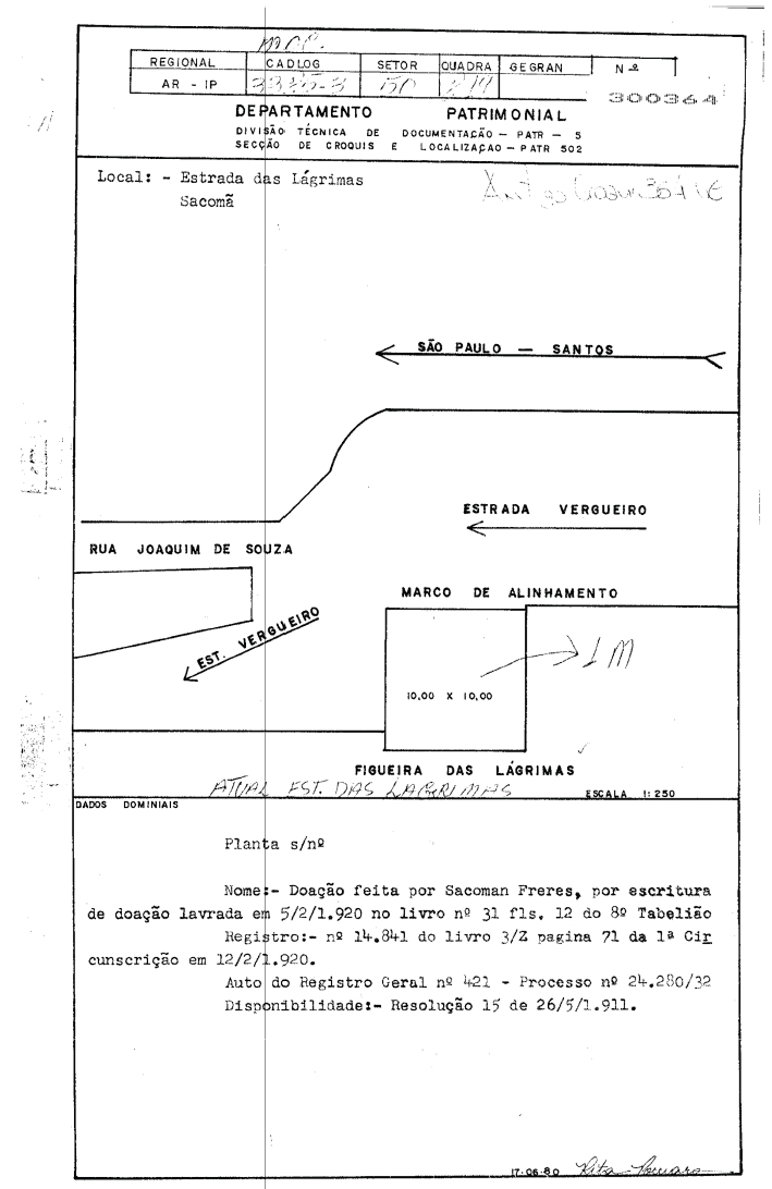 Em data de 25, recebi dos industriaes Sacoman Frères,62 estabelecidos no Ypiranga, a honrosa incumbência de offerecer a esta edilidade a tradicional Árvore das Lágrimas, situada em terrenos de propriedade daquelles srs., na Estrada do Moinho Velho e bem assim a necessária área para a sua conservação, conforme planta do Engenheiro Bianchi, já apresentada à Municipalidade.63