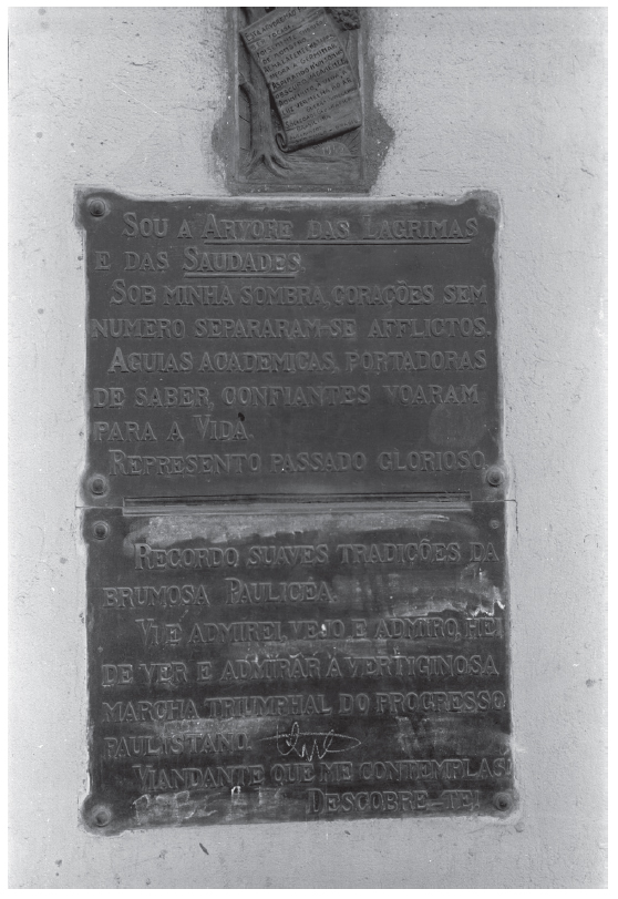 Sou a arvore das lagrimas e das saudades. Sob minha sombra, corações sem numero separaram-se afflictos. Aguias académicas, portadoras do saber, confiantes voaram para a vida. Represento passado glorioso. Recordo suaves tradições da brumosa paulicéa. Vi e admirei, vejo e admiro, hei de vêr e admirar a vertiginosa marcha triumphal do progresso paulistano. Viandante que me contemplas, descobre-te!82