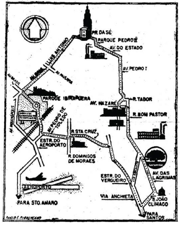 Sintoma do deslocamento da centralidade da cidade para o quadrante Sudoeste, a figueira-brava foi citada como “um grande motivo para um pequeno turismo”86 e até um mapa era apresentado ao leitor (Figura 35), para que pudesse visitar a árvore, em um circuito cuja ênfase é dada para três grandes obras do IV Centenário, as vedetes do momento: o parque do Ibiraquera, o aeroporto de Congonhas e a via Anchieta, cujo traçado selou em definitivo o distanciamento que o caminho para Santos havia tomado em relação à centenária figueira-brava desde a abertura da estrada do Vergueiro.