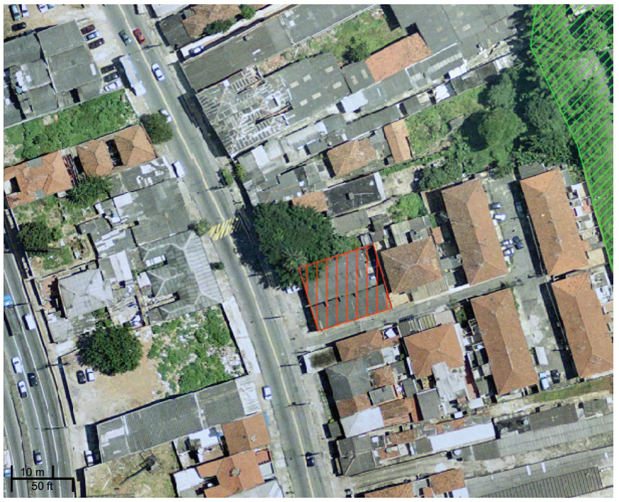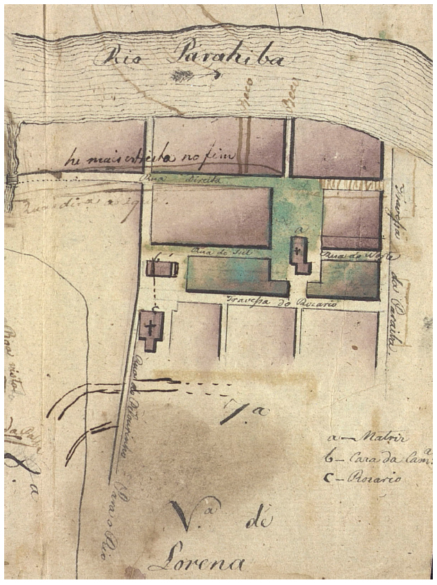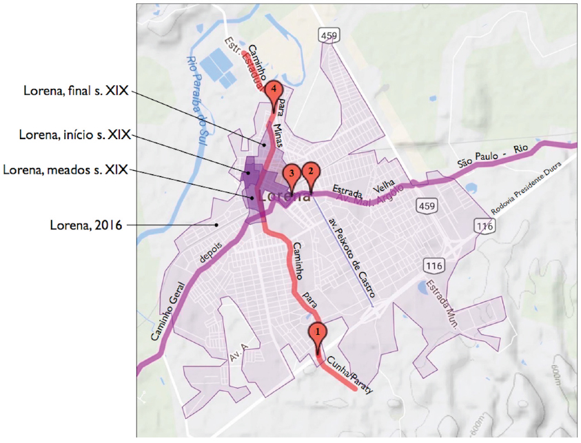 Sobre o tecido urbano atual aplicou-se o perímetro urbano da vila no início do século XIX, tomando-se como referência a imagem produzida por Pallière em 1821, que provavelmente não deveria ser muito diferente da extensão do núcleo urbano quando de sua elevação a vila, três décadas antes, em 1788. Em seguida, foram aplicados os perímetros resultantes dos mapas organizados por José Geraldo Evangelista30 a partir de dados censitários da Câmara Municipal de Lorena, relativos à situação da vila em 1850 e no fim do século XIX, quando foram produzidos os primeiros registros fotográficos dessas árvores, e assim pôde-se verificar que de fato as figueiras distribuíam-se de maneira a demarcar as entradas da cidade (Figura 6).