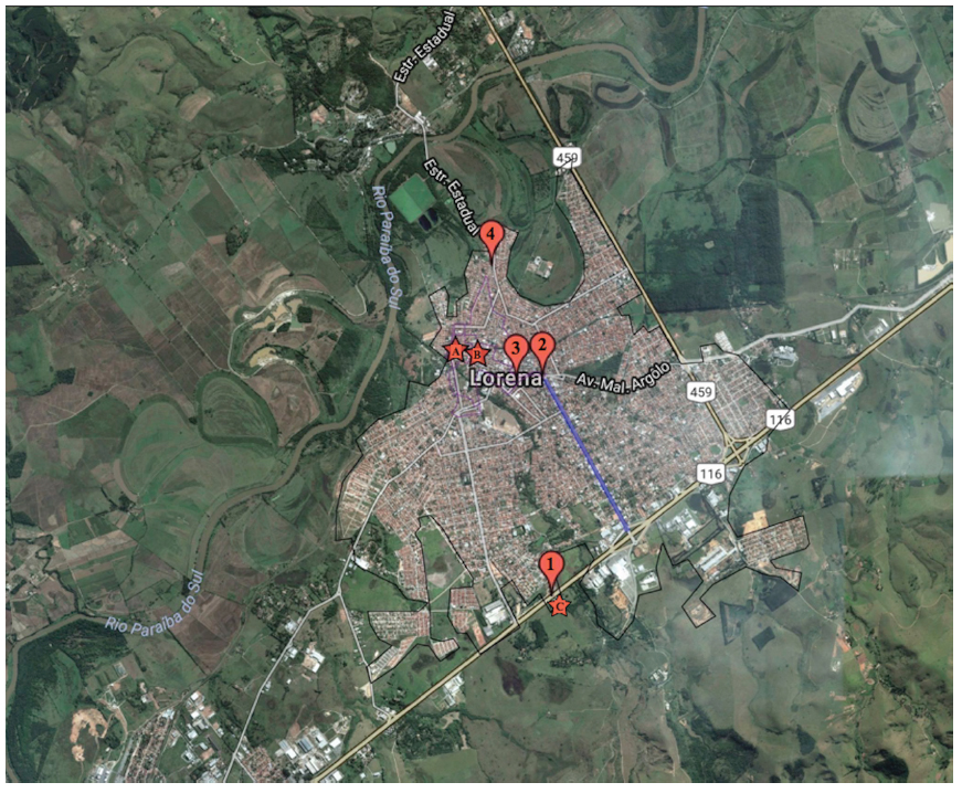 As figueiras-bravas de Lorena estavam ligadas aos acessos à cidade, e todas elas deram origem a ruas ou largos. Confrontando as imagens e os relatos a respeito dos exemplares lorenenses, foi possível recuperar sua localização no tecido urbano atual e em relação ao núcleo original da cidade, onde se situa a Igreja Matriz (a); ao principal espaço público lorenense, a praça Dr. Arnolfo de Azevedo (b); e ao ponto onde se dava o cruzamento entre o antigo caminho para Cunha e a rodovia Presidente Dutra (c). (Figura 4).