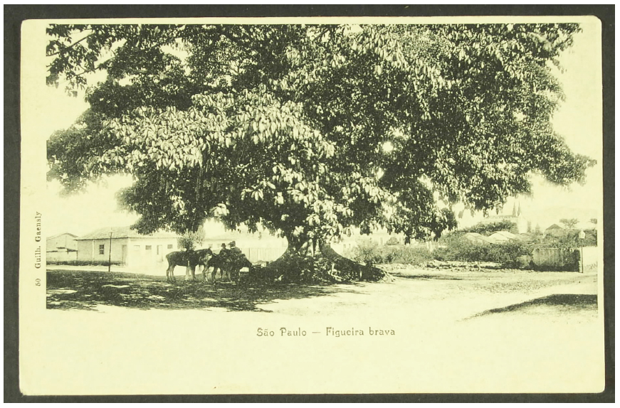 Em vista dessa campanha, liderada pelos jornais da época e que mobilizou fortemente a opinião pública, tempos depois os “Sacoman Frères” estavam dispostos a doar a figueira à administração municipal. Nesse momento, aquela figueira-brava tinha grande apelo simbólico, a ponto de sua poda ou, antes, sua mutilação, ser motivo para a confecção de cartões-postais, como se observa no raríssimo exemplar mostrado na Figura 29.