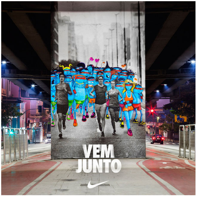 Um desses casos foi a confecção de um graffiti em homenagem às Olimpíadas de 2016, em um dos pilares do viaduto do Minhocão. No processo, fez-se a solicitação à CPPU com a premissa de “incentivo ao esporte”, mas, posteriormente, quando concretizado, o pilar foi objeto principal da propaganda da Nike pela cidade, com anúncios que traziam a foto do graffiti ao fundo, com a frase “Vem junto” (Figura 2). Dessa forma, a arte pública foi utilizada como peça publicitária, e passou despercebida pela CPPU, pois não foi possível pressupor sua intenção subliminar.