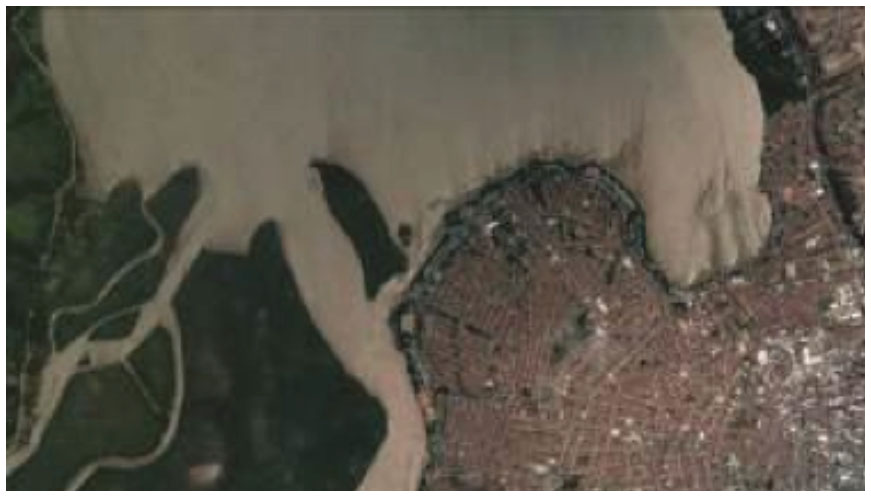 Na praia, vê-se o alongado dos arrecifes, quase retilíneo, paralelo à costa, interrompido na entrada do canal rumo à Madalena. À frente das enseadas, como uma estreita tira bordada, comparece a linha dos caminhos.