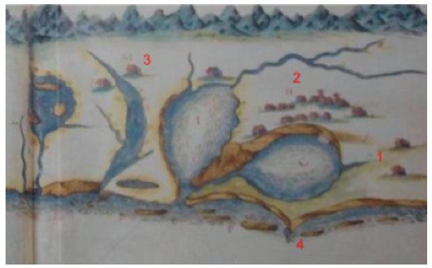 Além dos caminhos, o mapa de Marcgraf sinaliza outros elementos de permanência do território de Maceió que confirmam os elementos representados nas cartas de Albernaz: as pontas de “Ioçara” (atual Pajuçara) e de “Iaragea” (Jaraguá) e a lagoa Mundaú. Amplia-se a listagem com o riacho Doce, também pertencente ao atual território do município.