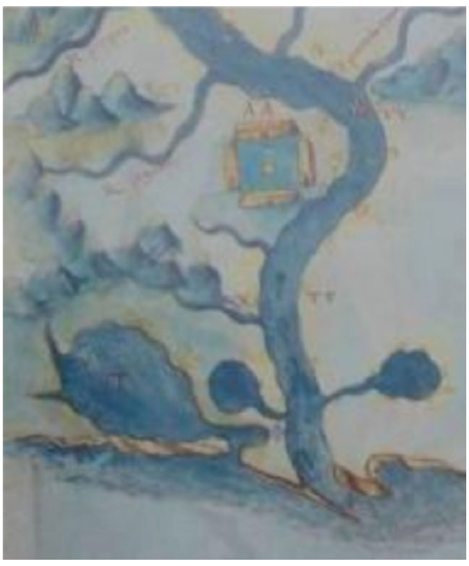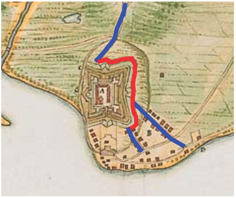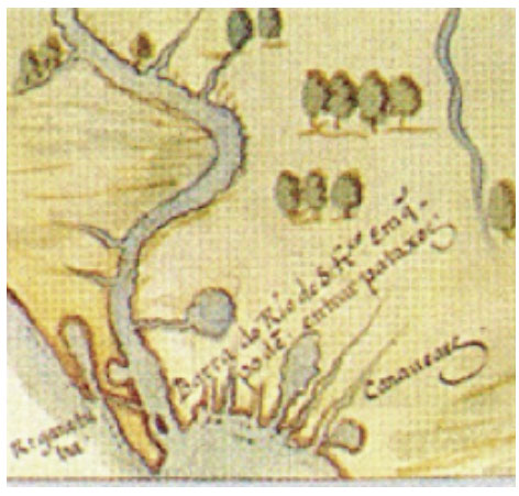 Nos mapas podem-se identificar alguns caminhos que saem do forte e se dirigem à margem do rio. Observa-se que, de acordo com as imagens, a fortificação foi construída circunscrevendo a capela de Santo Antônio,34 que ficou dentro da praça de armas. É provável que, inexistindo o forte, esses caminhos fossem em direção à margem do rio, fazendo a ligação entre a capela e o porto. Alguns passam paralelos à margem, dirigindo-se para longe da vila, fora dos limites do mapa. Dois outros saem de trás do forte. Um bifurca-se e avança também para rumo ignorado. Bem próximo à bifurcação, está representada uma construção, provavelmente a capela do Rosário dos Negros. Outro caminho liga essa capela à de Santo Antônio e prossegue (Figura 40).