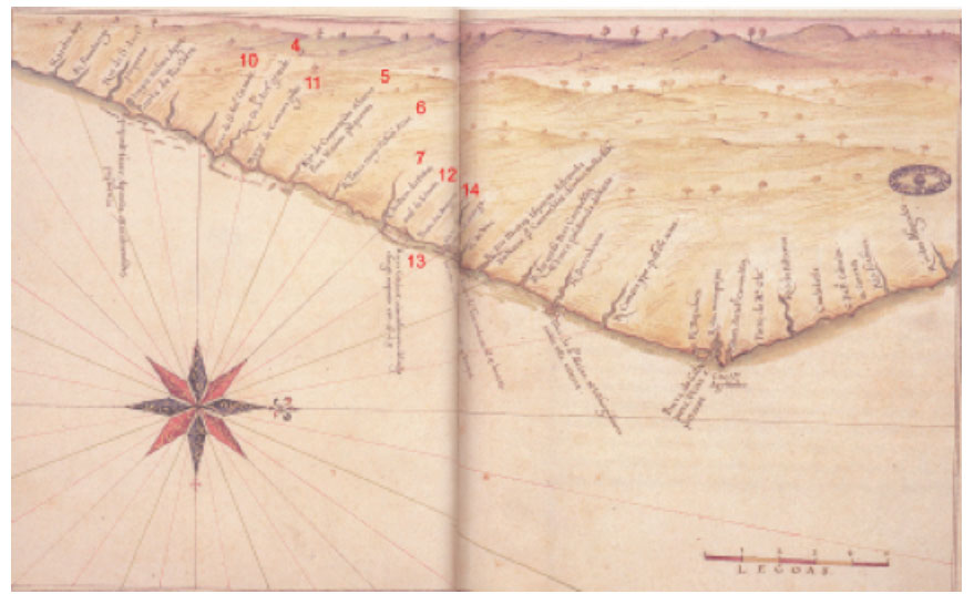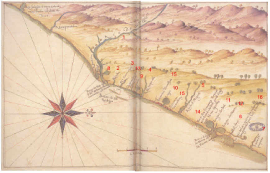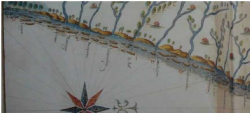 O último mapa (Figura 17) abrange uma faixa de terra situada entre o Riacho Doce, território alagoano, e o Rio dos Afogados, território pernambucano. O texto que o acompanha não traz muitas informações, mas indica a Barra Grande como o principal porto do trecho: “dentro dos Recifes, o principal [porto] he a barra grãde que esta em altura de nove graos e hu terço largos e outros como na demostração cõ muita clareza se pode ver”.