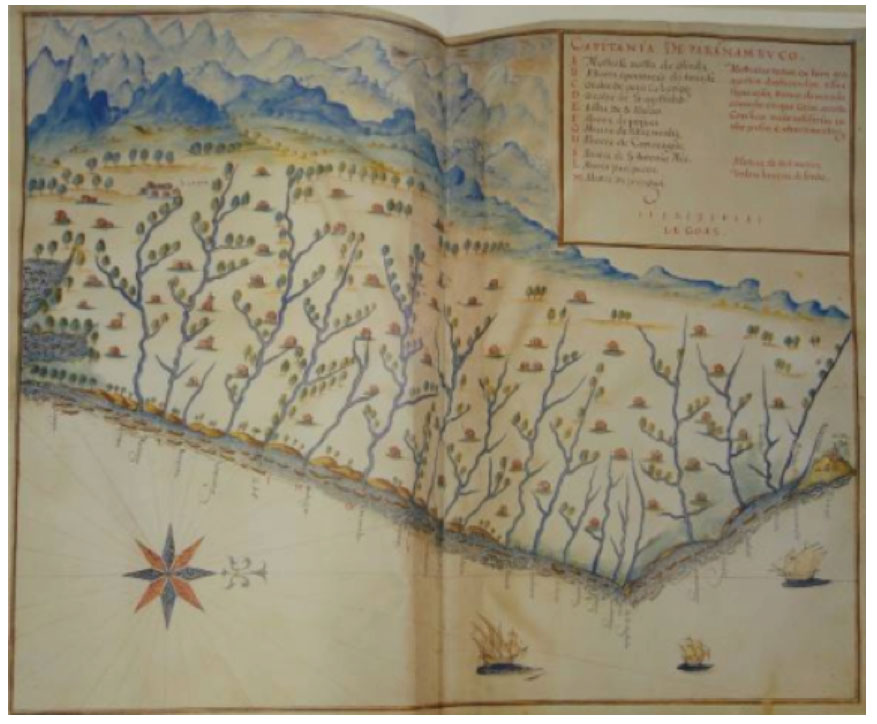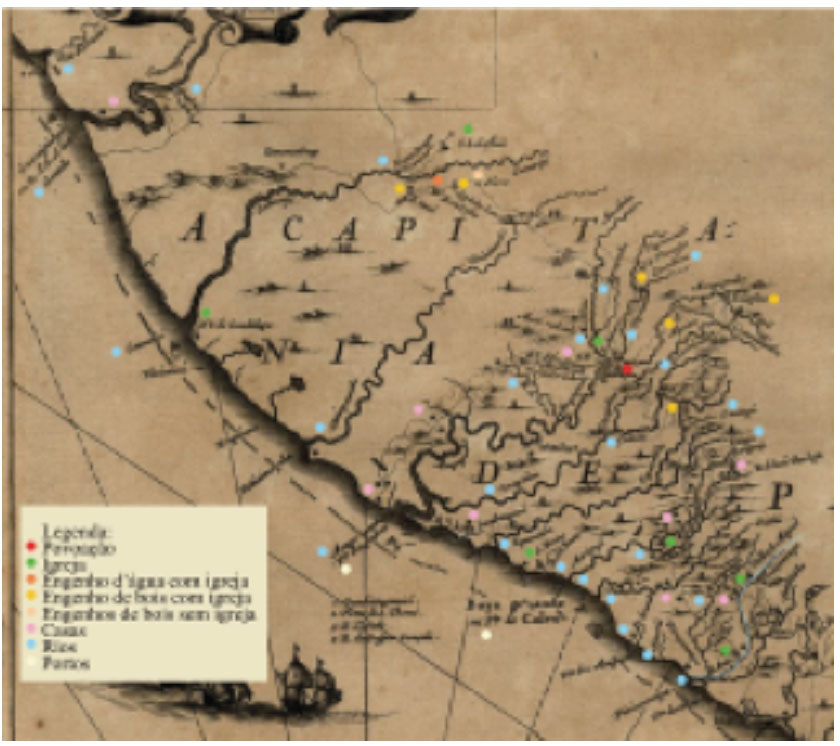 Nesse mapa não foram indicados textualmente engenhos de açúcar ou outros tipos de estrutura correlatas a essa atividade econômica. Entretanto, a partir do texto contido na legenda pode-se compreender a intenção dessa carta, e de expressiva parte do material cartográfico seiscentista, de se colocar como guia, sobretudo para acesso às propriedades produtivas: “Mostrãoce todos os Rios e os acentos das fazendas e sua separação, e como demorão e o modo em que corre a costa. Com suas mais nesesárias conhecensas e advertimentos”.