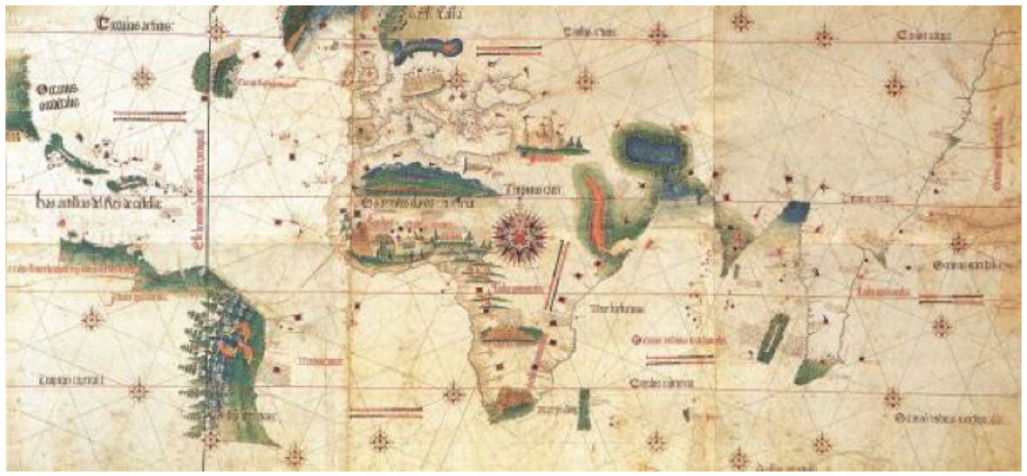 A civilização, do ponto de vista ocidental, vem do oceano. O cartógrafo deixa de lado a marcha através do sólido e se detém nas águas. É o azul pintado do seu mapa que puxa para si os ícones da civilização. Nele flutuam os navios, a rosa dos ventos. Equipamentos para o viator.