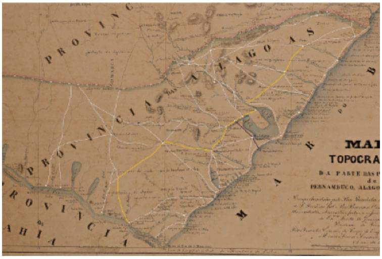 Além de desempenhar importantes atividades econômicas, Alagoas possuía ainda uma posição geográfica estratégica, principalmente por ser a região próxima ao rio São Francisco, atravessada pelo principal caminho terrestre de passagem para a capitania da Bahia. Nesse período, embora seja claro o privilégio às vias fluviais, as estradas de terra também consistiam em importantes elementos de interligação entre os pontos de ocupação esparsos no território. Marcgraf registra diversos caminhos que serpenteiam pela superfície do mapa, ligando diversas localidades, mas sobretudo engenhos e povoações. Há também estradas que ligam pontos habitados no território a rios, portos ou ao mar (Figura 25).