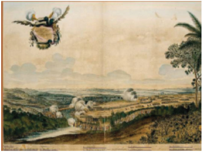 O território no âmbito dos mapas analisados, portanto, foi inicialmente referenciado pela geografia e povoado a serviço do escoamento da produção da colônia para a Europa. Foi o porto sua grande marca, que séculos mais tarde também promoveria a ocupação mais efetiva da região. Dentro do sistema agroexportador vigente à época, o território da futura capital também participa das grandes mudanças trazidas com a presença holandesa. Barléu relata o episódio de guerra no qual João Maurício de Nassau desembarca em Jaraguá. “O Conde Maurício […] saltou em terra junto à ponta de Jaraguá não longe das Alagoas, e perseguiu o inimigo até o rio de São Francisco”.39 Nesse tempo o território alagoano passa por mudanças, movido pela aventura dessa invasão que desestabiliza os poderes instituídos pela colônia portuguesa e, assim, a estrutura econômica estabelecida na região, promovendo quedas e ascensões no mundo do açúcar.