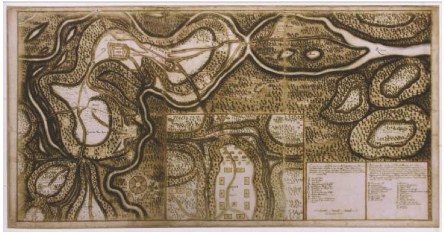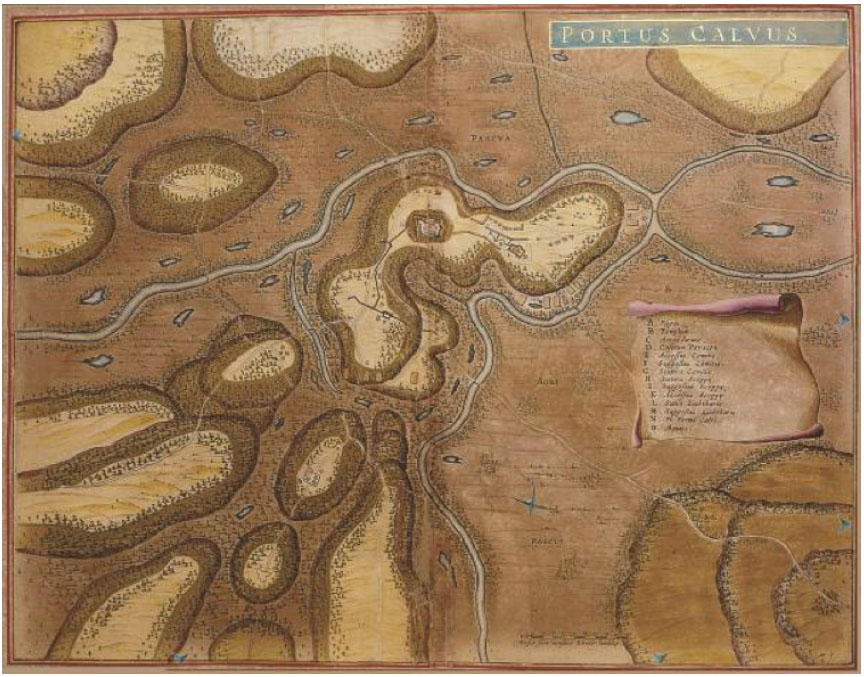 A análise de cartas e mapas perspectivados de Porto Calvo encaminham para a hipótese de que prevalecia a importância da estratégia militar como razão das representações iconográficas da vila. As imagens posicionam o núcleo urbano em uma situação de guerra. Soldados, a marcha das tropas e outros detalhes podem ser identificados na vista realizada por Frans Post. Procurava-se fortificar os pontos de chegada das tropas inimigas. O forte apresenta-se instalado na parte mais alta, permitindo maior visibilidade do porto e dificultando o acesso à vila (Figura 30).