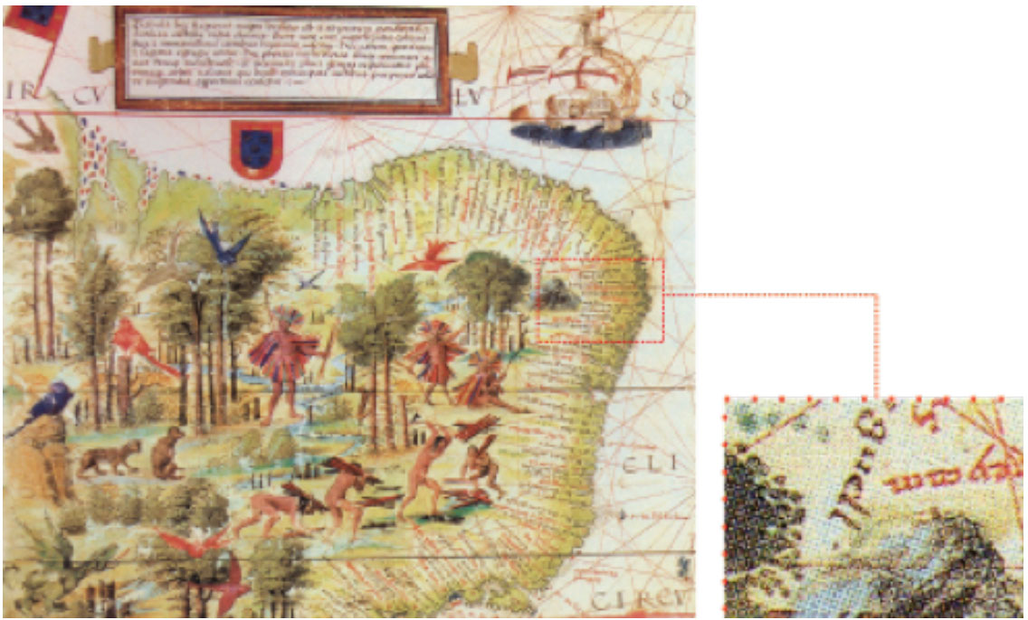 No famoso planisfério de Cantino de 1502 (Figura 2), em traços finos que se delineiam por trás das imensas araras - únicos ícones desenhados na zona verde que mostram a costa do futuro Brasil -, observam-se as indicações dos rios São Francisco e São Miguel.