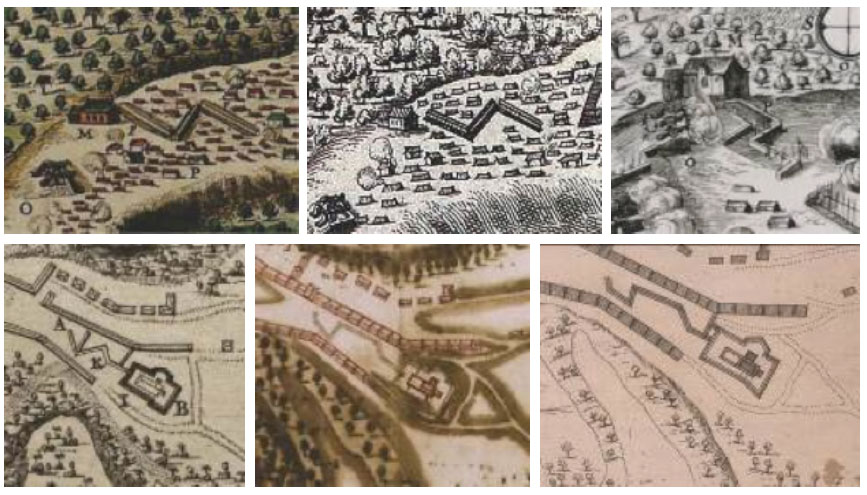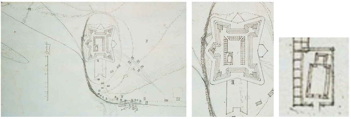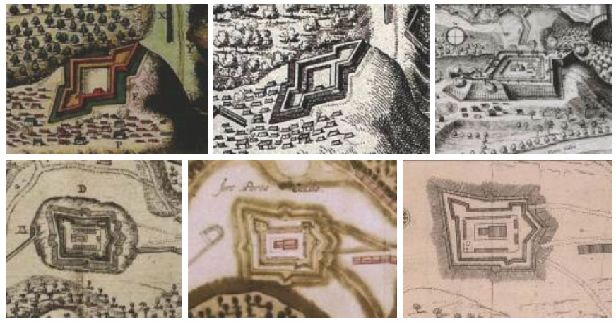 Outras diferenças foram ainda identificadas. Nos mapas perspectivados, a igreja aparece sem nenhuma obra de fortificação; conta com uma murada ou trincheira em forma de “Z” na sua frente, mas não se encontra envolta por proteção. As casas distribuem-se aleatoriamente, próximas à igreja e ao forte. É difícil saber se havia também no local algum acampamento.