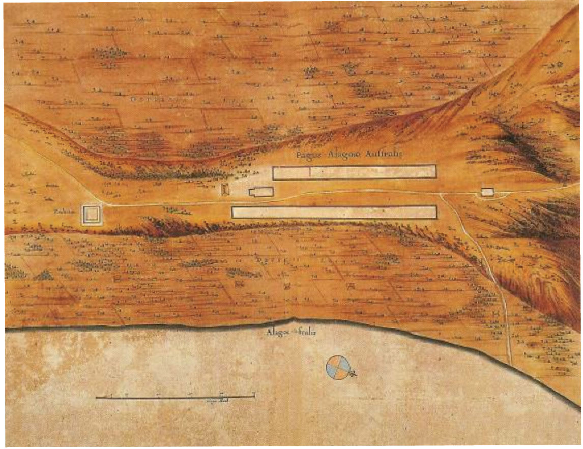 Ao modo da cartografia da família Albernaz, o mapa também finaliza-se com a indicação de colinas ou montanhas. De fato, o terreno do povoado sobe para um platô, onde se distinguem vários “altos”, como o da Jacutinga. Os navios se concentram na área do atual porto e comprovam o significado do nome de Jaraguá entre os indígenas: “enseada das canoas”.43 Sinalizando os dois lados para onde a cidade cresceu, alongando-se para a direita vê-se a enseada de Pajuçara. Mas de fato o mapa privilegia o lado esquerdo, para onde o povoado se dirigiu nos seus primórdios, no rumo onde se comunicava com a vila de Santa Maria Madalena, através dos canais que interconectam as lagoas de Mundaú e Manguaba.