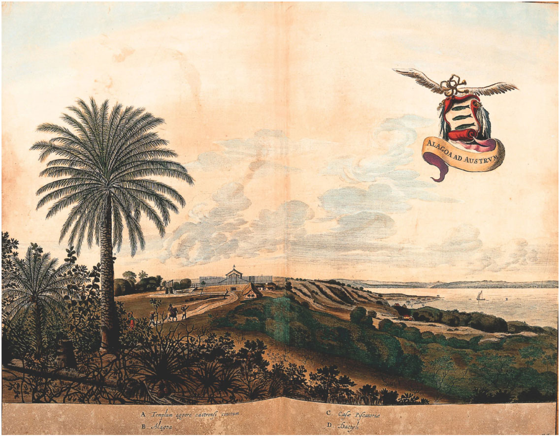 A cidade de Maceió, atual capital do estado de Alagoas, não possui registro como lugar edificado no material cartográfico seiscentista examinado. Na verdade, surgiu como um pequeno povoado de apoio ao porto de Jaraguá, e só ascendeu à vila em 5 de dezembro de 1815, por alvará de D. João VI, quando foi desmembrada da antiga vila de Alagoas. Passou a ser sede da província em 9 de dezembro de 1839.36 Seu nome também referenda o estatuto das águas que rege o território alagoano: significa “o que tapou o alagadiço”.