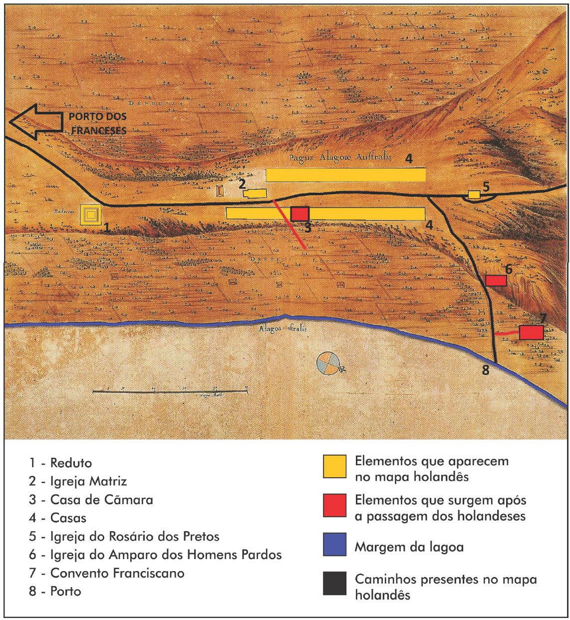 Dessa maneira pode-se observar que, dentro da vila, os elementos a nortearem os primeiros caminhos foram a capela de Santo Antônio, a do Rosário dos Negros, o porto nas margens do rio, e a ligação do núcleo urbano com outras localidades, direcionando os caminhos que partem para fora do espaço das representações holandesas.