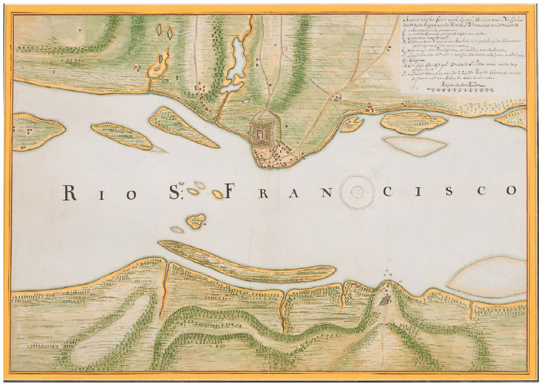 Enquanto as vilas de Bom Sucesso do Porto Calvo e Santa Maria Madalena da Alagoa do Sul destacavam-se pela produção de açúcar, a vila de São Francisco tinha um papel de defesa dos limites da capitania, devido à posição geográfica que a colocava no lugar de vigia da “porta” da capitania na direção sul. Essa posição se tornava ainda mais estratégica pelo fato de as navegações entre Bahia e Pernambuco serem difíceis durante a maior parte do ano. A conquista da vila São Francisco significava a garantia da posse da capitania de Pernambuco no seu limite sul, às margens do rio São Francisco, razão pela qual João Maurício de Nassau mandou edificar ali o forte Maurício, poucos meses depois de chegar ao Brasil,33 confirmando e reforçando a vocação de guarda da vila com a construção dessa edificação militar.