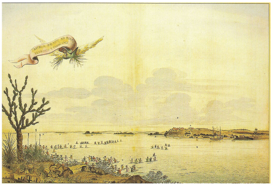 A vista de Frans Post (Figura 43), além das informações visuais, traz também uma legenda, de acordo com a qual estão apontados o forte Maurício, o rio São Francisco, a fuga dos portugueses em pequenas pranchas e as ilhas existentes no rio.