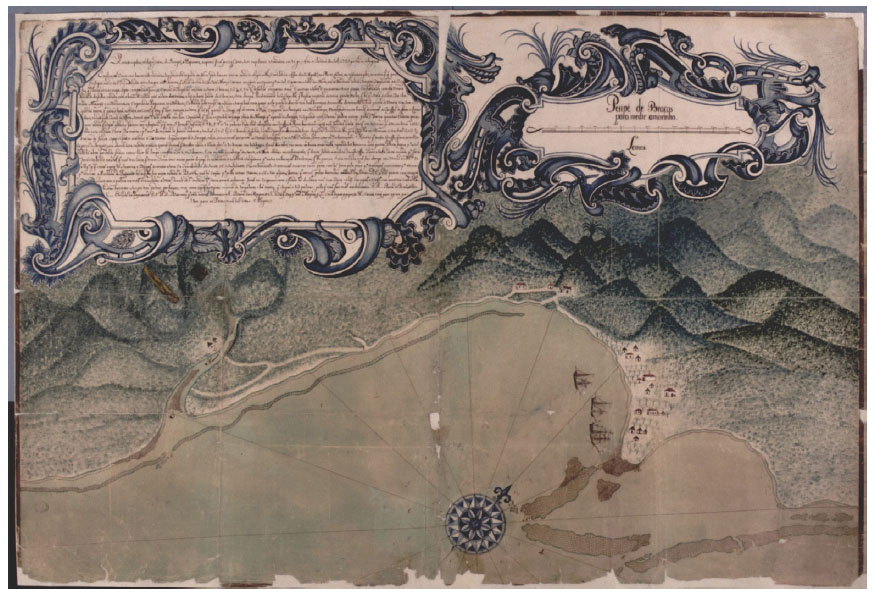 Esse ímpeto rumo à cultura da cidade deixou poucas marcas sobre Maceió. Ao porto acrescentou-se o uso das terras para a produção do açúcar, com a instalação de um engenho banguê já referendado em documento testamentário de 15 de setembro de 1724.41 O povoado em si passa silencioso pelos mapas; sua primeira versão imagética surgirá apenas mais tarde, em carta pertencente ao acervo do Arquivo Ultramarino.42 Trata-se de um manuscrito aquarelado de cerca de 1757 (Figura 44). O desenho da costa mostra duas enseadas, e na parte alta, ocupando expressiva área do mapa, comparecem dois grandes cartuchos com ornamentos em concheados e folhagem, onde se inserem a legenda e a escala. A imagem centra-se na representação das águas do mar, que abriga elaborada rosa dos ventos. O mapa divide-se, portanto, em duas grandes zonas de cor, representando o mar e as terras litorâneas. A faixa terrestre indica justamente as áreas de porto e um trecho de caminhos, sinalizando o sistema de escoamento de mercadorias.