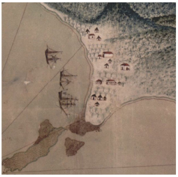 Considerando-se a estrutura tripolar apontada pelo mapa, a área de ocupação mais significativa encontra-se em torno do porto de Jaraguá, que reúne mais densamente ícones de casas e de coqueiros.