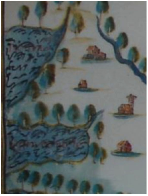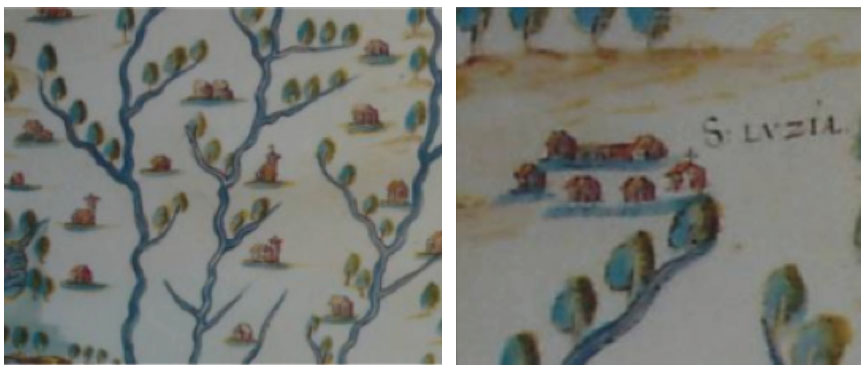 Na malha ondulada dos rios ampara-se a representação gráfica de diferentes edificações isoladas, algumas com torre e cruz, com dois ou mais volumes e ainda outras mais simples, apenas como se aludissem a casas. O único povoado representado com indicação gráfica e textual é o de Santa Luzia (Figuras 7 e 8). Santa Maria Madalena da Alagoa do Sul, a primeira e única vila situada na área das lagoas no decorrer dos séculos XVII e XVIII, e que, como se viu, alcançou esse estatuto já em 1636, não é referida. Santa Luzia, povoado contemplado com a representação mais completa - casario e nome - apenas foi elevado à vila em 1830.