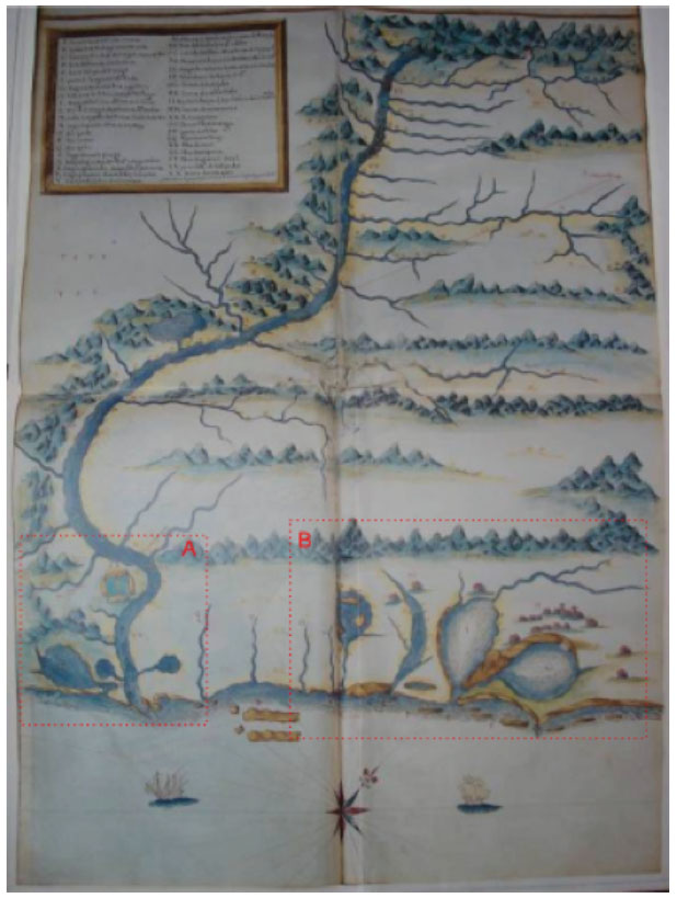 Caerte wa in asgibult wort de Bilvegeringe van Pouazon in Porto Calvo… Johannes Vingboons, ca. 1660. Original do acervo do Instituto Arqueológico, Histórico e Geográfico Pernambucano.