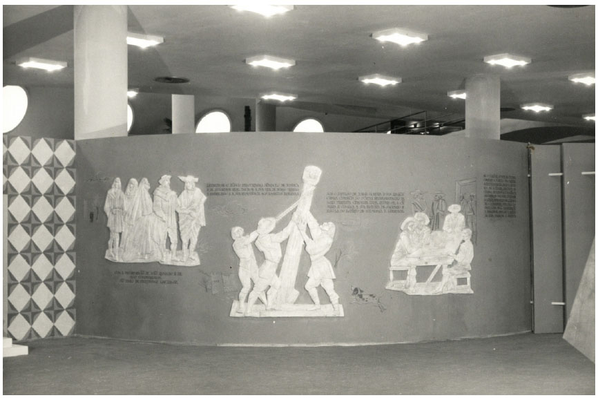 O último painel da seção, denominado “A criação da Vila” (Figura 12), era composto por três baixos-relevos feitos pela escultora portuguesa Irene de Vasconcelos, esposa de Manuel Lapa. No primeiro, vê-se uma representação da transferência dos moradores de Santo André da Borda do Campo para São Paulo de Piratininga; no que se encontra no centro, a representação é da instituição do pelourinho da vila de São Paulo; no último, está figurada a primeira sessão da Câmara de São Paulo, realizada em 1560, marco final do processo mencionado por Cortesão como a fundação de São Paulo. Nos textos que acompanhavam as representações escultóricas, todo esse processo era descrito: a ordenação para o povoamento expedida pelo rei português a Martim Afonso simbolizava “na fundação de São Paulo a grande capacidade dos portugueses para descortinar as vantagens da posição dos lugares eleitos do planeta”; Manuel da Nóbrega deu seguimento e estabilizou a primeira fundação; Mem de Sá, impelido por Nóbrega, transferiu o povoado para Piratininga e lhe concedeu foros de vila. A base de todo o movimento se fundava sobre a geografia, dando sentido àquela fundação que expressava a capacidade portuguesa de apreender o mundo. A liderança de Martim Afonso se fixava no sintético painel final, como o decurso da seção já anunciava.