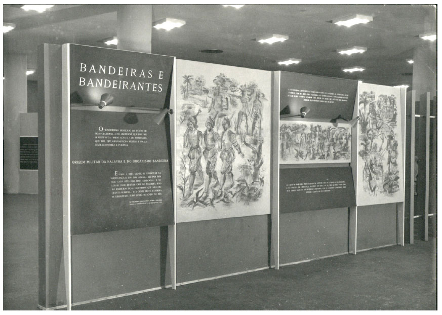 A ideia comunicada por meio de uma legenda no painel de abertura da seção reforçava o mote da exposição, sobre a dita unificação do território, além de ir ao encontro do ufanismo paulista que era respirado naquelas comemorações. Qualificando a expansão mineradora como paulista, o texto conferia a esses a liderança do impulso “que unificou o território e multiplicou o povoamento”, dando ainda ao Brasil, “com o súbito afluxo do ouro e do poderio, a consciência mais segura de uma entidade econômica, social e política, capaz de governar-se a si própria”. De tal modo, conduzia-se à interpretação segundo a qual o germe da autonomia brasileira seria fruto desse expansionismo paulista.