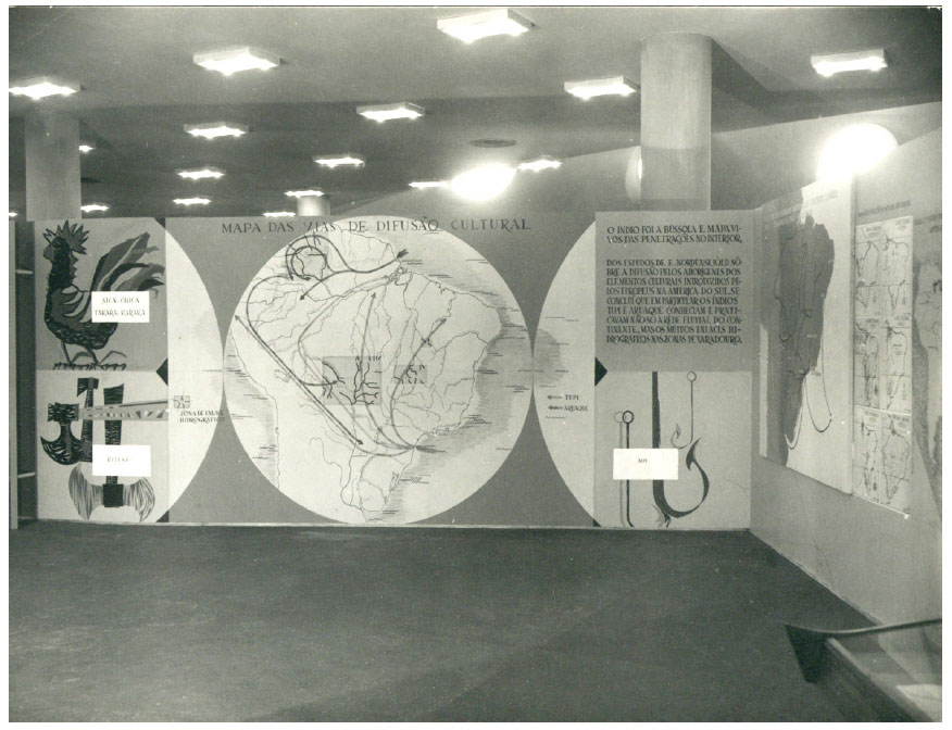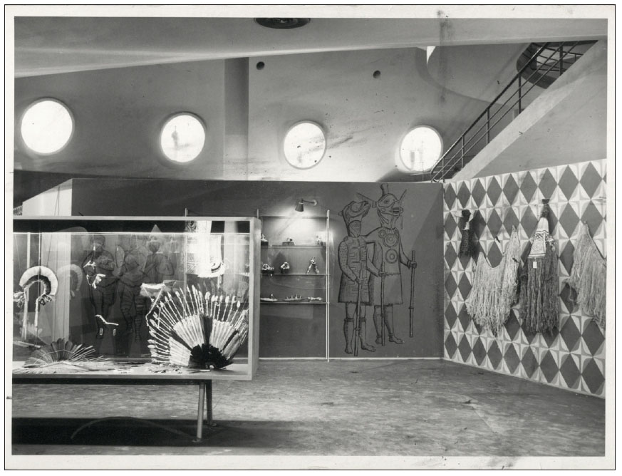 No interior da vitrine que aparece no primeiro plano da fotografia (Figura 4), adornos de cabeça, colares de penas, dentes e contas, entre outros, estão dispostos próximos a objetos cerâmicos e vestimentas, também representadas em desenhos ampliados. Na sequência, a cerâmica se destacava no interior de uma vitrine composta por objetos karajá como bonecas e esculturas de animais. Junto desse grupo, fotografias de cenas cotidianas xavante e de outros povos, provavelmente Karajá, foram apresentadas. A cerâmica foi ainda apresentada por meio de mapas sobre a distribuição dessa técnica pelo território brasileiro, identificando especialmente os grupos Guarani, Tapajó, Marajoara e Kadiwéu como seus principais artífices. O tema da seção que leva o nome da “Cultura do índio” foi encerrado com uma instalação que demonstrava um acampamento de praia karajá, com paravento armado, esteiras, canoa, cuias, cestos, pratos, rede, lança, entre outros objetos.