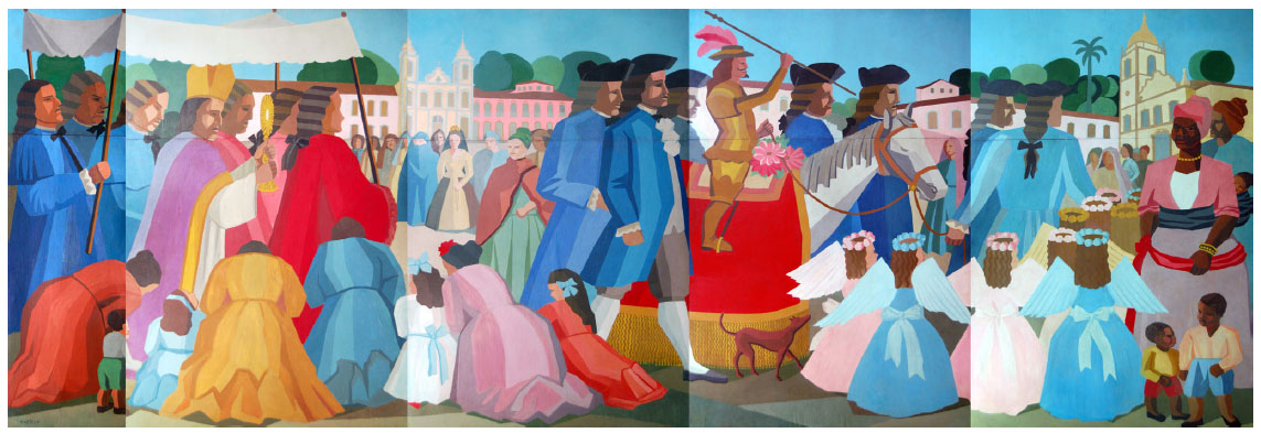 O painel de encerramento da seção foi um mural de Tarsila do Amaral (Figura 15) que representa uma procissão de Corpus Christi na São Paulo de meados dos Setecentos, próximo de uma imagem de São Jorge em madeira, desmontável, que era conduzida a cavalo nessas ocasiões. O cavalo com a representação do santo montada sobre ele figura no mural da artista modernista, no qual são também identificáveis as coloniais igrejas da Sé e de São Pedro, ambas no antigo Largo da Sé. Próximas às crianças vestidas de anjos, à direita da imagem, figuram uma mulher e duas crianças negras, aparentemente assistindo ao cortejo composto por homens de azul a trazer o cavalo, que segue à frente do padre com o ostensório, sob o pálio sustentado por um outro grupo.