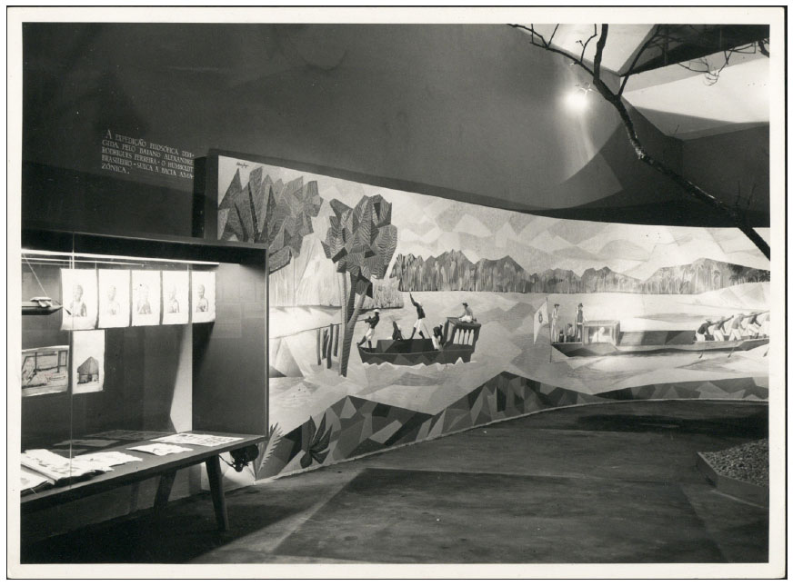 Além dos mapas, apresentaram-se também desenhos de animais, armas, instrumentos musicais e mecânicos, ornatos, utensílios domésticos, bem como dos índios produtores desses objetos. Outros apresentavam também a forma de construção de canoas e as habitações da região amazônica. O mural de Artur Jorge apresentava, junto desses documentos, a Expedição filosófica dirigida por Alexandre Rodrigues Ferreira, o Humboldt brasileiro, na bacia amazônica. Essa parte da exposição, retratada na fotografia capturada no dia de sua inauguração solene (Figura 17), demonstrava que no quadro da história do Brasil eram muitas as permanências da ação das bandeiras, das monções, das expedições filosóficas e mesmo da expansão marítima portuguesa.