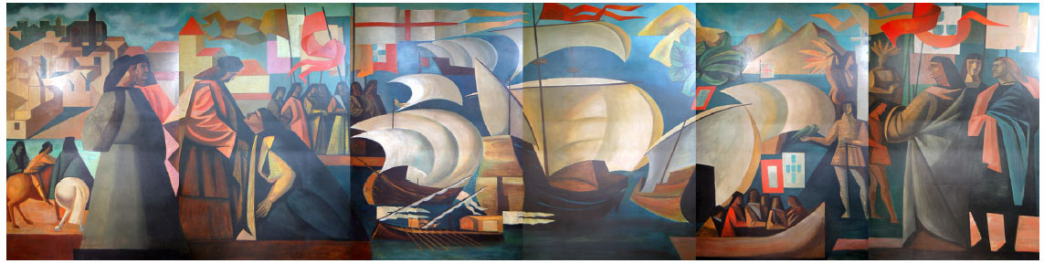 A imagem (Figura 1) apresenta um aspecto da primeira seção, no qual figura em destaque uma rosa dos ventos estilizada em vidros coloridos e iluminada de dentro. A imagem indica uma linha progressiva entre os painéis e vitrines, compondo uma sequência temática e cronológica. Considerando estes aspectos, o ponto inicial de toda a mostra era a Partida das naus do Restelo e a chegada das naus ao Brasil, representada por um mural de Manuel Lapa (Figura 2), artista modernista português que participou ativamente de todos os trabalhos junto de outros artistas modernistas. Com as embarcações no centro do mural, marcam-se do lado esquerdo alusões ao embarque em Lisboa e do lado direito o desembarque no Brasil, figurando dois indígenas ao lado do que parece ser um padrão de descoberta. A epopeia das descobertas também era representada por retratos e esculturas do Infante navegador D. Henrique, de São Vicente, de D. Manuel e do Infante Santo D. Fernando (Figura 3). De acordo com o texto das legendas que acompanham estes vultos, São Vicente é identificado enquanto patrono dos descobrimentos e da “primitiva grei paulista”, por ter sido o orago da primeira capitania.