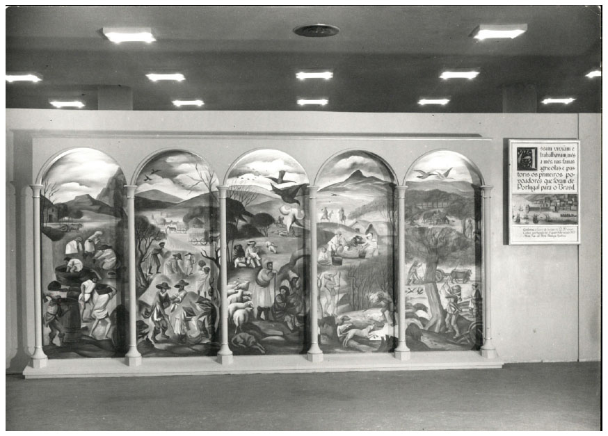 A legenda, aludindo a um manuscrito iluminado, inscrevia: “Assim viviam e trabalhavam mês a mês nas fainas agrícolas e pastoris os primeiros povoadores que foram de Portugal para o Brasil”. Nesses termos, a descrição e a imagem pretendiam compor, somados aos elementos antes trazidos, uma caracterização idealizada do português que aportou no Brasil, destacando as diversas qualidades construídas a partir de influências diversas de outros povos. Procurou-se singularizar os tidos como mais típicos aspectos culturais lusitanos, com o objetivo principal de “restituir a civilização brasileira, quer à sua maior profundidade histórica, quer às suas relações de origem com a história de Portugal”, de acordo com o texto do catálogo.
