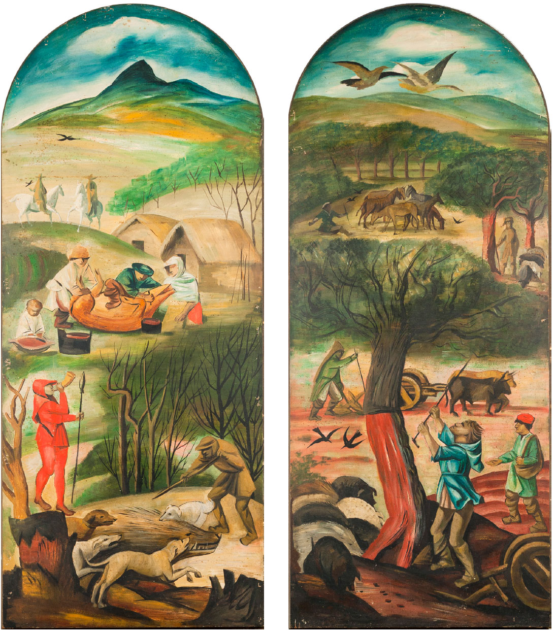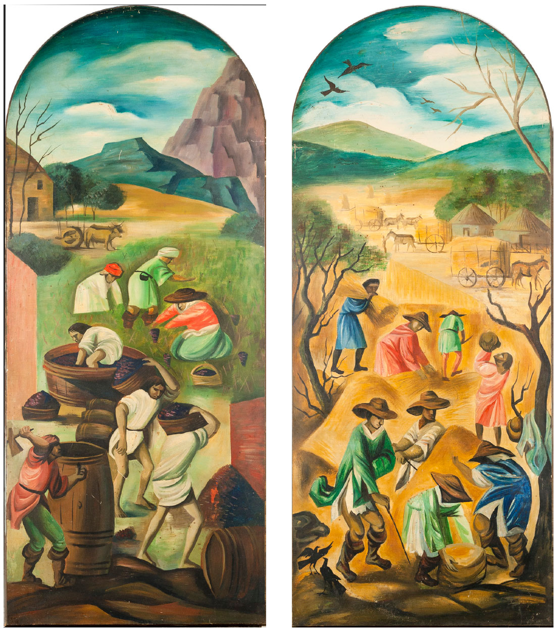 Com destaque especial, a cultura náutica foi representada por meio de objetos de navegação, roteiros e livros, bem como pela miniatura de uma caravela, “criação náutica portuguesa e instrumento que serviu ao descobrimento dos litorais”, conforme sua legenda. A Figura 5 apresenta a disposição de tal trecho da mostra. Abaixo da miniatura de caravela provavelmente encontra-se a vitrine com objetos relativos à atividade náutica. Ao lado, o penúltimo painel relativo a Portugal trazia reproduções ampliadas de gravuras antigas representando funções reais no começo do século XVI, tais como a regulação comercial, a administração jurídica, o trato direto com os mercadores do laconicamente referido “tráfico oriental”, a fidelidade às Ordenações do Reino, entre outras. Encerrando os painéis e vitrines sobre o assunto, um políptico de Manuel Lapa, de traços modernos, representava em cinco quadros os trabalhos agrícolas e pastoris dos portugueses no século de Quinhentos, como se vê nas Figuras 6 a 10.
