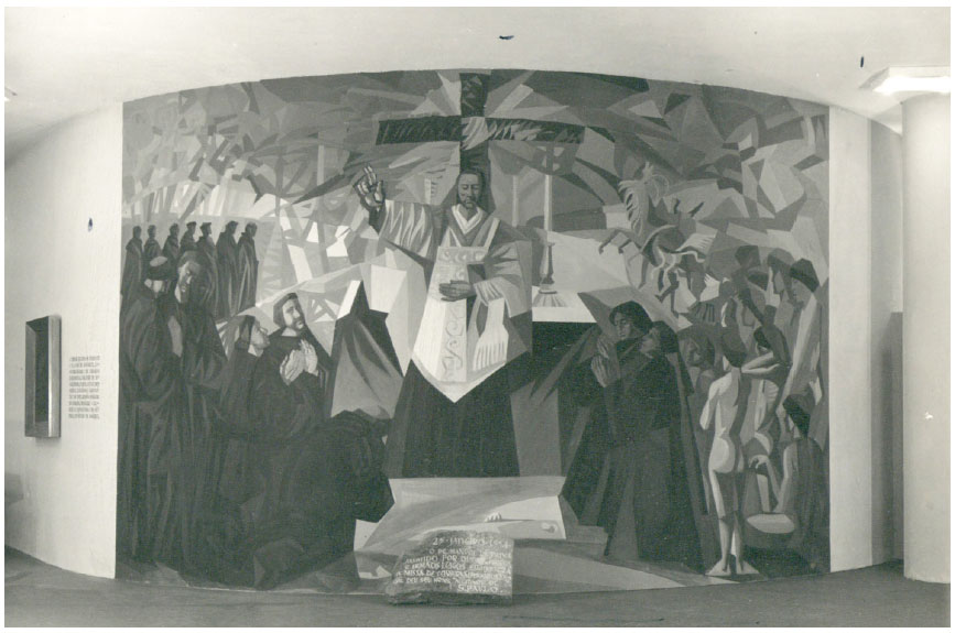 A fundação de São Paulo - o evento de 25 de janeiro de 1554 - foi concentrada na figura do padre Manuel da Nóbrega, a cuja ação aludia a ilustração feita pelos artistas da exposição. Reforçando o gesto fundador e buscando inspirar um sentimento cívico em quem visitava a exposição, a legenda que a acompanhava chamava Nóbrega de “grande missionário e estadista” perante a quem o Brasil se inclinava. Ao lado de outros jesuítas, o padre teria lançado os novos fundamentos da povoação do planalto e lhe dado “espírito de continuidade”. Um mural de Manuel Lapa, feito com a colaboração de Fernando Lemos (Figura 11) representava então a missa da fundação, celebrada em 25 de janeiro de 1554. Em letras gravadas sobre pedra antiga, em alusão aos objetos quinhentistas presentes na exposição, a legenda solene posta aos pés do painel modernista em que figuravam índios, padres e colonos registrava: “25 - janeiro - 1554. O Pe. Manuel de Paiva, assistido por outros padres e irmãos leigos jesuítas, reza a missa da conversão do apóstolo que deu seu nome à cidade de S. Paulo”. A missa de fundação era representada de acordo com a estética em voga e não nos moldes acadêmicos da virada do século. O público visitante visualizaria então o simbólico ato fundador da cidade de São Paulo de acordo com a estética que dava novas feições ao parque onde se comemorava a grande festa, à cidade e à sua narrativa histórica. Quatrocentos anos depois, fundava-se a cidade moderna.