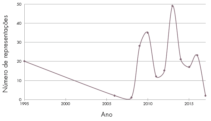 O enquadramento dos manuscritos como patrimônio português (Lei n. 13/1985) foi relevante para a pesquisa, pois a partir disto foi possível reconhecer a inerência dos seguintes valores dos arquivos manuscritos:37 valores cognitivos, valores formais/estéticos, valores afetivos e valores pragmáticos. Esse ponto de vista é significativo, pois as representações dos arquivos manuscritos foram entendidas como decorrentes do uso dos arquivos para vários fins (por exemplo, a publicidade, a criação artística e fins comerciais)38 no contexto de práticas que enfatizam determinados valores e definem as qualidades das representações. A partir de características próprias e dos valores identificados, as representações foram categorizadas nas seguintes classes: (1) representações digitais; (2) representações fac-similares; (3) representações artísticas; (4) representações gráficas; e (5) representações visuais. A caracterização das classes será tratada na seção específica dos resultados que, por fim, foram agrupados num gráfico de dispersão que registra os dados quantitativos através de uma série temporal. Os tipos de práticas identificados também foram sistematizados com base em Aldabalde (2015).