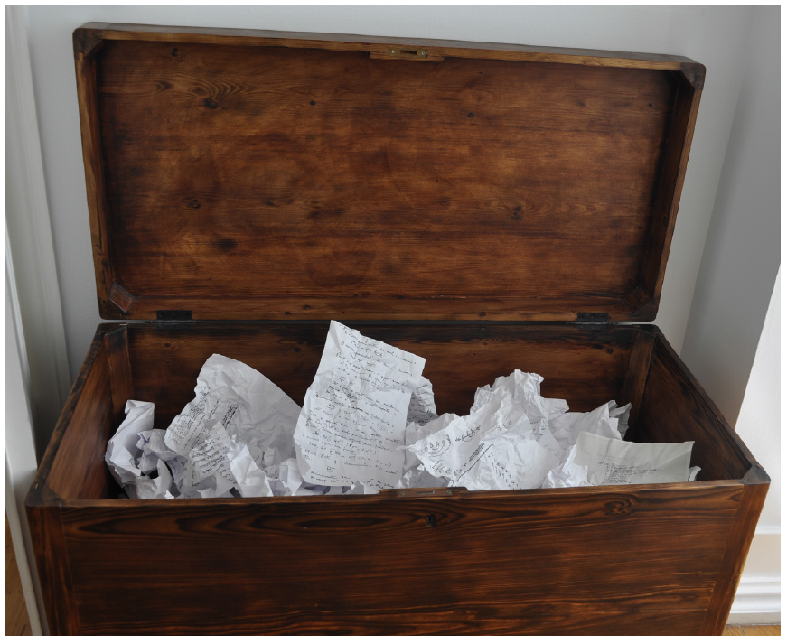A arca, um caixote de madeira castanho-vermelha com fechadura discreta e pés delicados, vendida em leilão (em 13/11/2008) por herdeiros de Teca, durante décadas serviu de adorno à sala de visita da casa da família. […] Papéis usa de muitas cores: azul claro, branco, cor-de-rosa, sépia. Em parte manuscritos e em parte datilografados (em fitas azuis, pretas, roxas, verdes e vermelhas). […] usa pedaços de jornais, faturas comerciais, papel timbrado de firmas que trabalha ou “de cópia”, folhas de calendário, costas de envelopes já utilizados, “o verso de uma carta”, espaços em branco de outros textos, por vezes sem assinatura ou incompletos; e apaga o excesso de tinta com um “mata-borrão branco sujo” que fica “por sobre a grande idade da secretária inclinada”. Esse móvel, pequeno e simples, na Rua Coelho da Rocha, ficava à direita da porta do quarto - segundo me confirmou Antônio Manassés, que lá ia quase diariamente nos seus últimos anos, e está hoje na Casa Fernando Pessoa.79