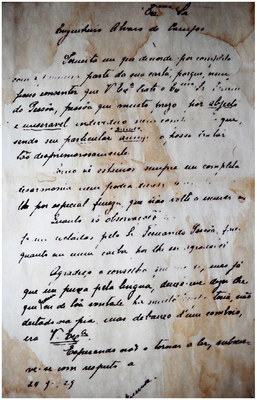 A concepção da CFP como projeto de internacionalização é condizente com o interesse pelos arquivos manuscritos de Pessoa, que está para além de Portugal. Os brasileiros, por exemplo, estão entre os principais públicos porque, dentre outros motivos, possuem a língua e a história em comum com os portugueses. Um indicador da relevância dada ao legado pessoano é seu espaço na imprensa brasileira. Em 16 de janeiro de 2016, o jornal Folha de São Paulo48publicou uma reportagem sobre a descoberta de arquivos manuscritos de autoria de Pessoa, enfatizando o espólio associado ao literato, com destaque para um manuscrito de mais de 2 mil páginas. Somado à repercussão na mídia, há um impacto da obra pessoana para a economia cultural do Brasil, pois Pessoa está presente em empreendimentos editoriais e artísticos. Um exemplo disso é o repertório da cantora de música popular brasileira Maria Bethânia. No álbum “Maricotinha ao vivo” de 2002, o “Poema do Menino Jesus” de Alberto Caeiro ocupa a faixa 23. Outro registro da cantora é encontrado no álbum “Dentro do mar tem rio (ao vivo)”, de 2007, na faixa 33, com a seguinte adaptação do texto “Ultimatum”, que tem circulado intensamente desde 2016 nas redes sociais no Brasil: