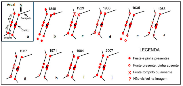 A variação nas condições de integridade das colunas entre 1848 e os dias atuais é ilustrada esquematicamente na Figura 12, tendo como base imagens publicadas por Niemeyer,56 Ferreira,57Revista da Semana,58 Corrêa,59O Globo60 e Ronaldo Morais.61 Constata-se que, a partir de 1929, das colunas ora existentes, apenas três mantiveram os fustes íntegros: duas laterais ao dístico e uma à esquerda da entrada sul. Todas as pinhas, sem exceção, foram removidas em algum momento.