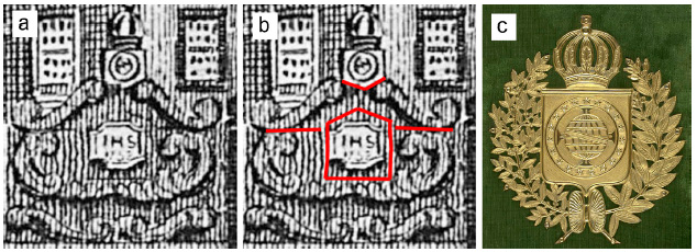 Além de apresentar diferenças na forma e no número de colunas, o dístico decorativo retratado por Niemeyer é também distinto do atual. Na imagem do engenheiro, esse é formado por quatro blocos cujos limites são indicados por linhas de junção (Figuras 13a,b). No topo, há um emblema e uma coroa que guardam semelhança com o Brasão Imperial do Brasil (Figura 13c). No centro, está o brasão jesuítico, gravado em bloco hexagonal com as iniciais IHS e a data. O topo do brasão está encravado em uma cantaria com espirais decorativas. Na base do conjunto, há outra cantaria com espirais. Nota-se, contudo, que o desenho das aspirais difere do atual.
