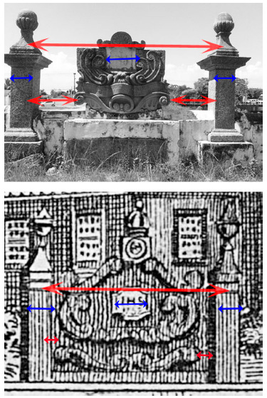 As colunas que ladeiam o dístico na imagem de 1848 exibem entre si o mesmo espaçamento das colunas atuais, mas apresentam diferentes distâncias em relação ao dístico, como pode ser observado nas linhas que ilustram relações de proporção (Figura 14), revelando que o conjunto anterior apresentava maiores dimensões.